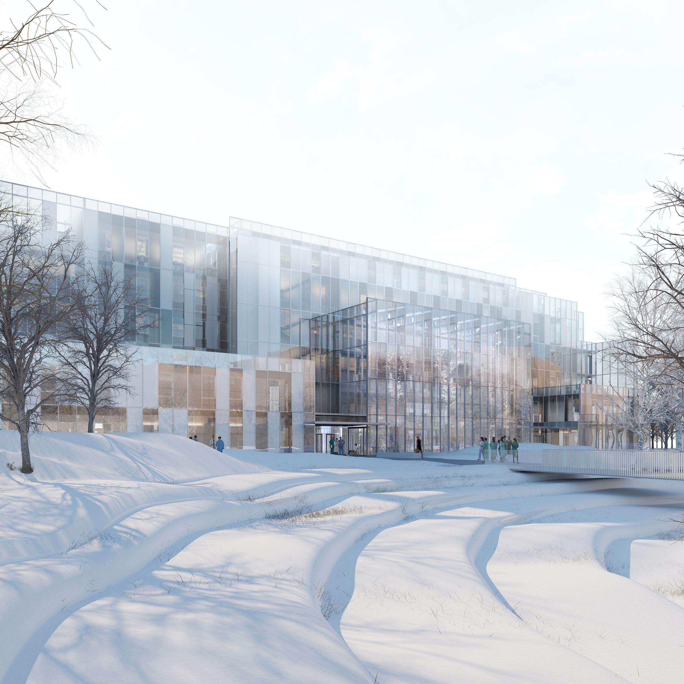 The open spaces between the datcha and the contemporary structure will be centred around an atrium orchestrating the flux of natural light and the dialogue between the ancient and the new.This new medical centre is inspired by the essence of European medicine founded on the idea of assisting the patient through a passage of wellbeing. The atmosphere of the project is aimed to create a climate of serenity and tranquillity. An equilibrium embedded through the architectural design, landscaping and patrimonial heritage. The architectural structure and multiple facades takes into account the strident climate in Moscow. In essence, various types of architectural glazing will be applied to these facades from transparent and translucent to reflective and opaque these will ultimately offer a sense of homogeneity throughout the project. These diverging facades aim also to reflect canopies of vegetation in the surroundings outlining the theatrical characteristic of this place and in effect, unifying the datcha, the contemporary structure and the users of the medical centre.
