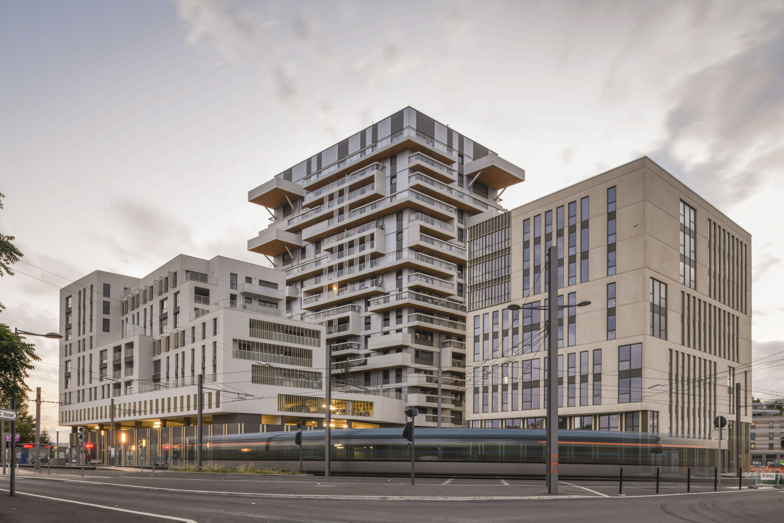Surrounding the tower is a 9-story building composed of 54 units of social housing and 22 properties. A second lower building nearby is dedicated to offices while both ground floors house shops.