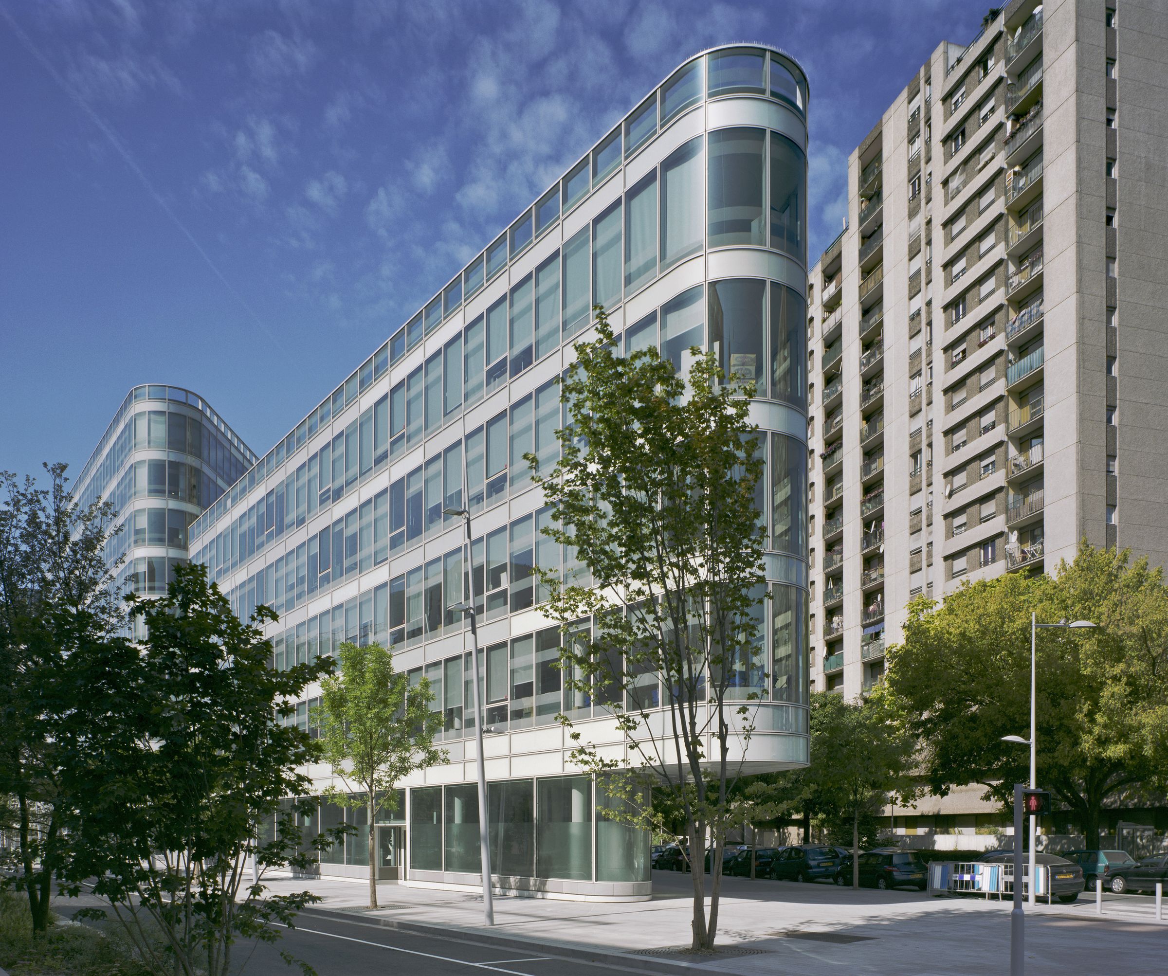 It is a large building, easily identifiable, which occupies a strategic position between the two major traffic axes, at the entrance to the neighborhood. As the program requires maximum profitability of the surface, the building strictly follows the shape of the lot, freeing up space for an atrium. It takes on the dynamic appearance of a ship that advances its bow towards the intersection.