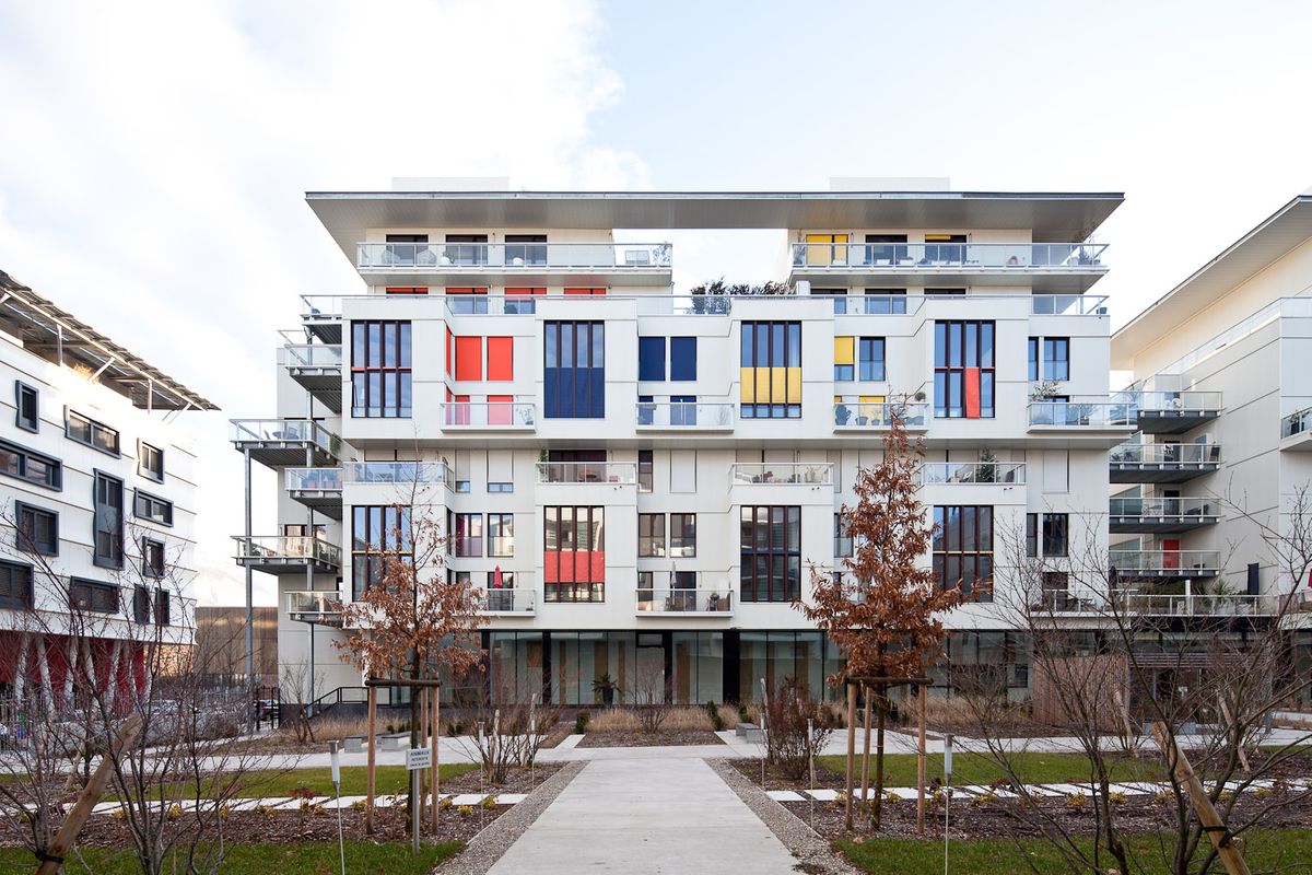 The duplexes are distributed on four floors around the interior park. The facades open onto the park thanks to loggias advancing towards the garden or to large bay windows aligned with the facade. These openings, glazed over the entire height of the duplexes, visually bring the landscape into the living room. The ensemble has a domestic scale evoking the image of a human community sharing common values.