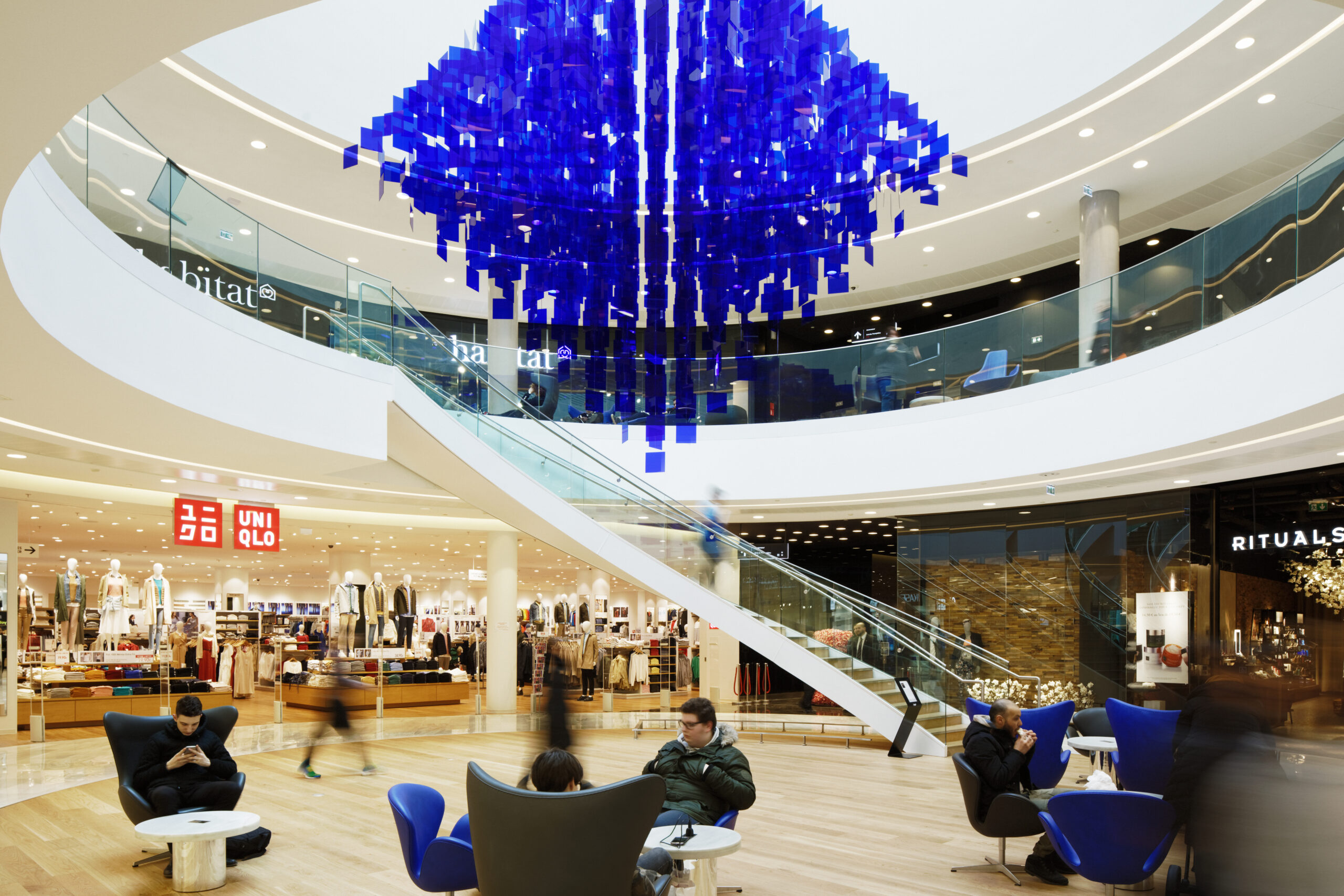 Au Sud, précédant la place accueillant l’immeuble d’habitations Le Sérénissime, un grand espace vertical de circulation relie la surface commerciale au niveau de stationnements.