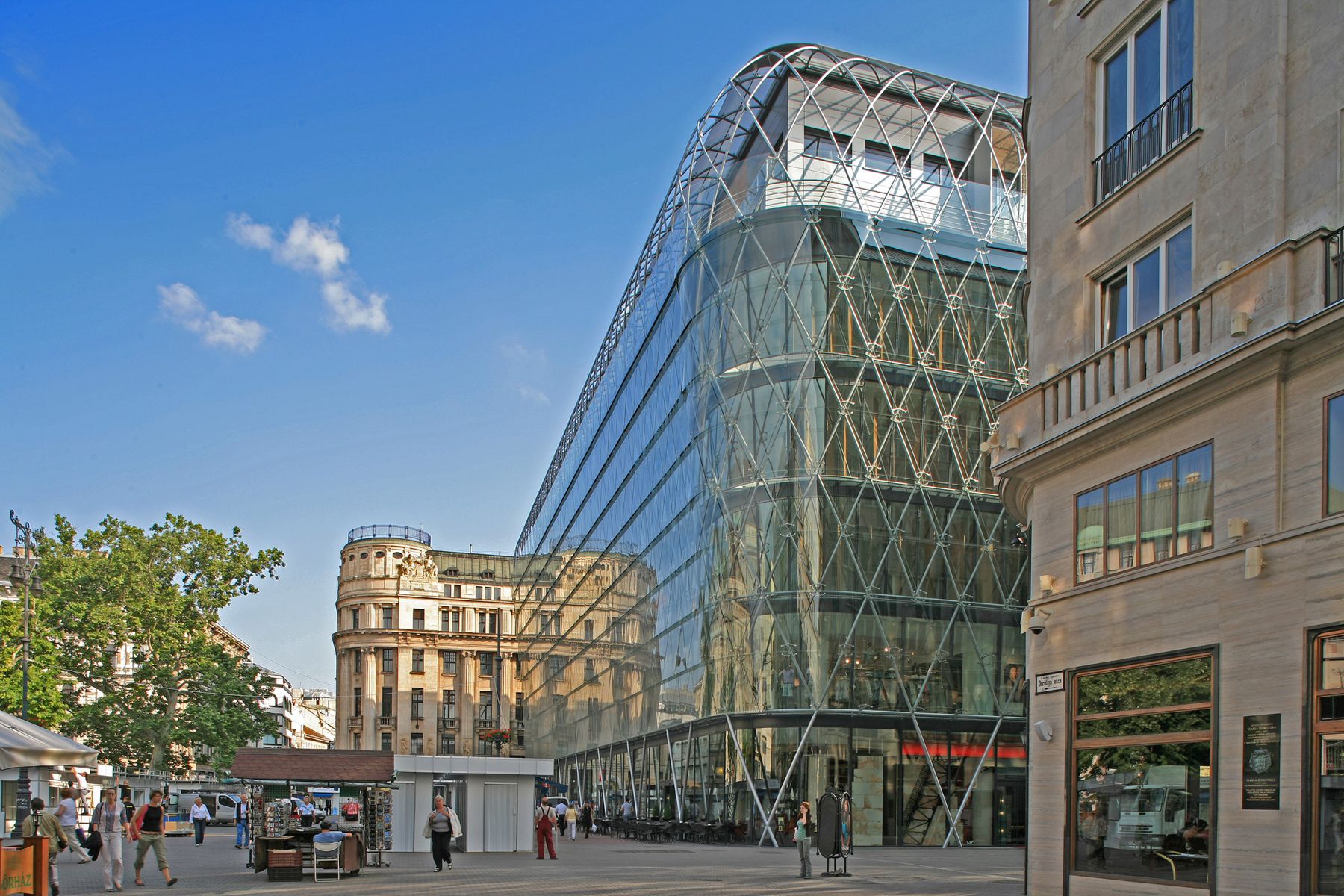 The terrace overlooking Vorosmarty Square offers a spectacular view of the old city, the Danube and the Royal Castle, facing the upper town of Buda and the famous thermal baths. The concrete structure of the building, composed of cylindrical columns, is dressed by a glass envelope in the form of scales held by a metal mesh structure.