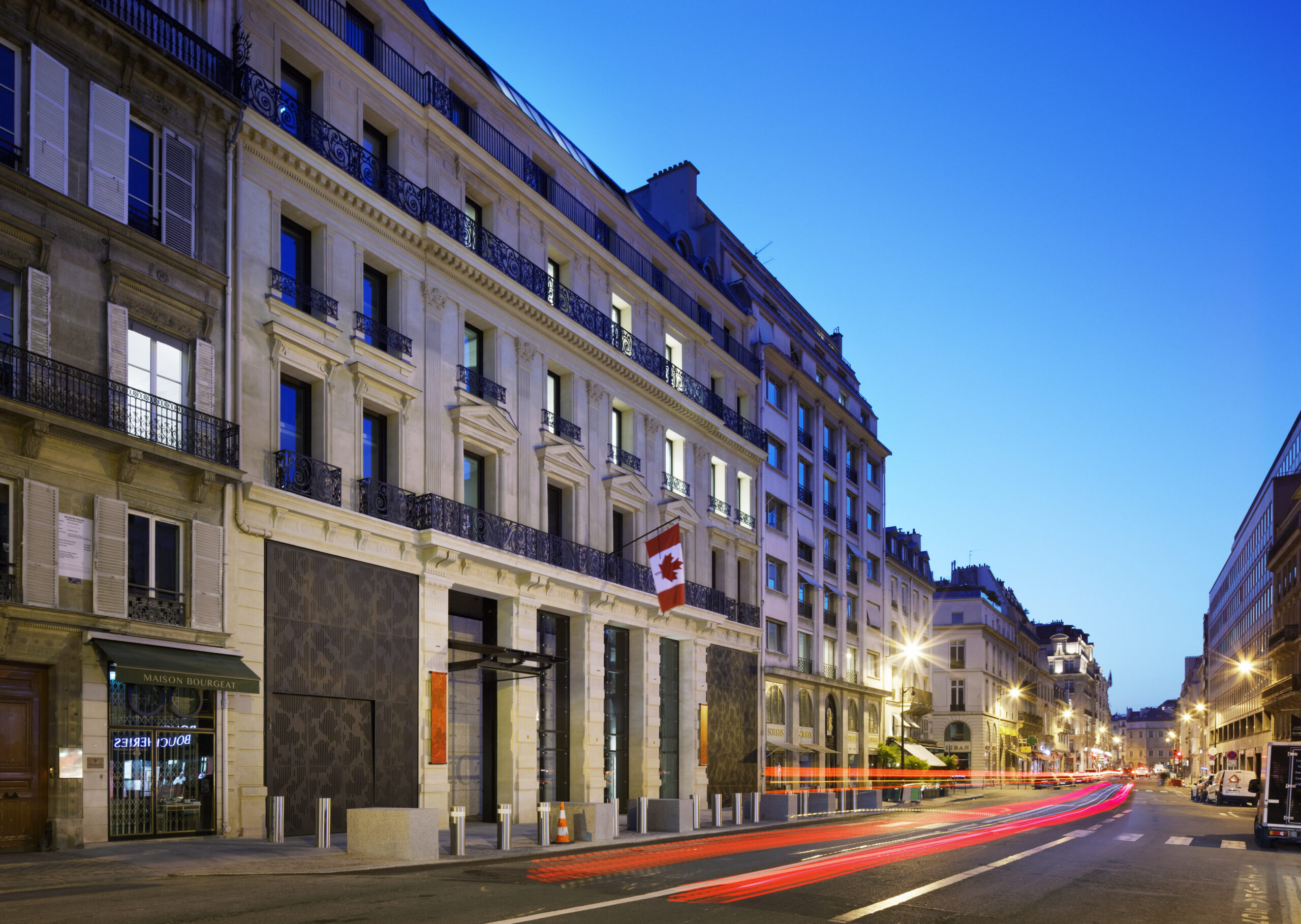 La rue du Faubourg Saint Honoré se distingue par son architecture d’écriture haussmannienne de la fin du XIXe siècle. Avec ce site, l’Ambassade bénéficie d’un double ancrage: la façade du bâtiment la rattache à la France et à Paris tandis que la présence du Centre culturel signifie une entrée accueillante en territoire canadien.