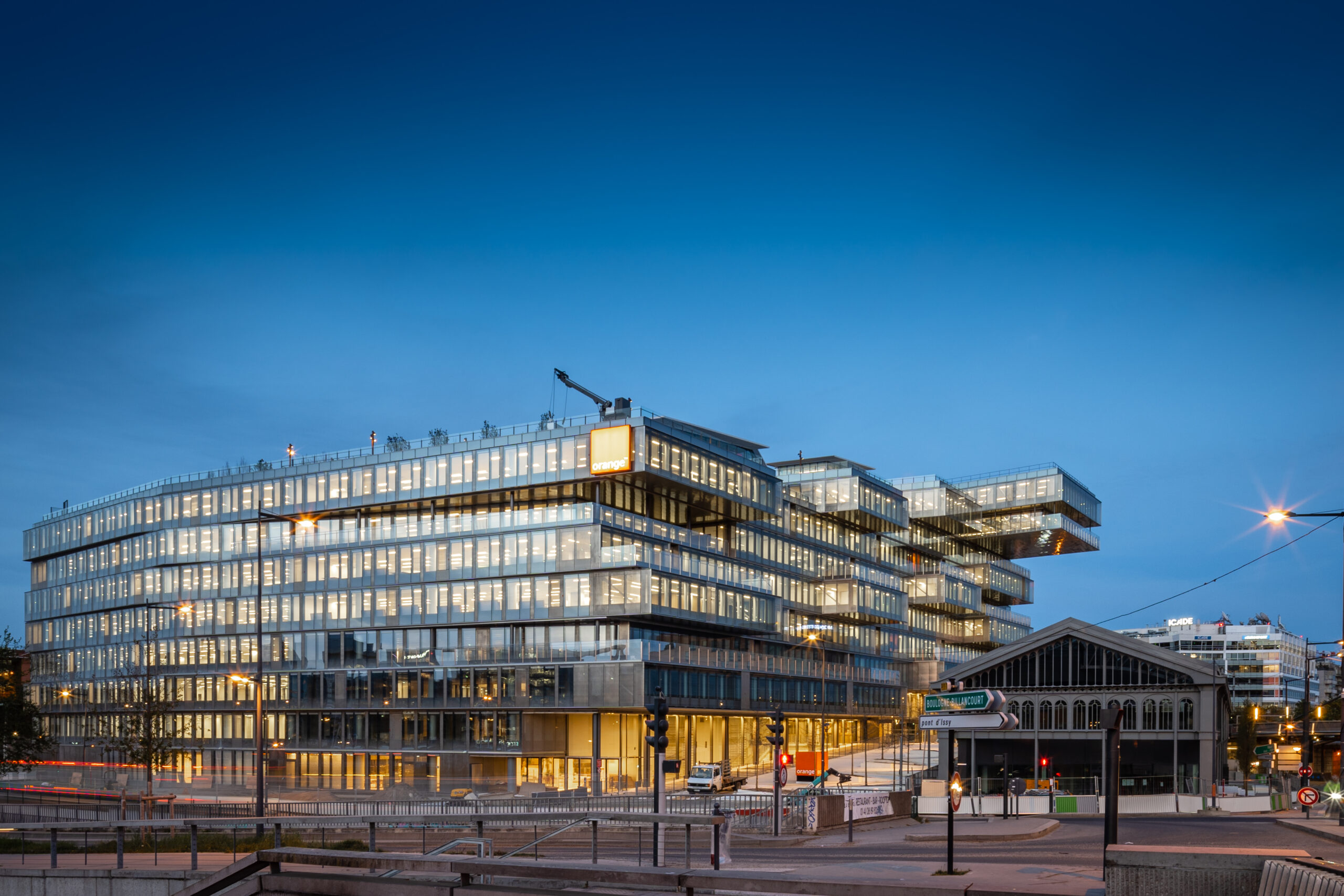 L’utilisation de matériaux choisis pour leur esthétique brute (bois, métal, pierre, béton…) tend vers la simplicité pour créer un environnement de travail serein et inspirant pour les quelques 5 000 collaborateurs et visiteurs qui occuperont les lieux sur 10 niveaux. La halle Eiffel abrite pour sa part des espaces de coworking, commerces et restaurants accessibles au public.
