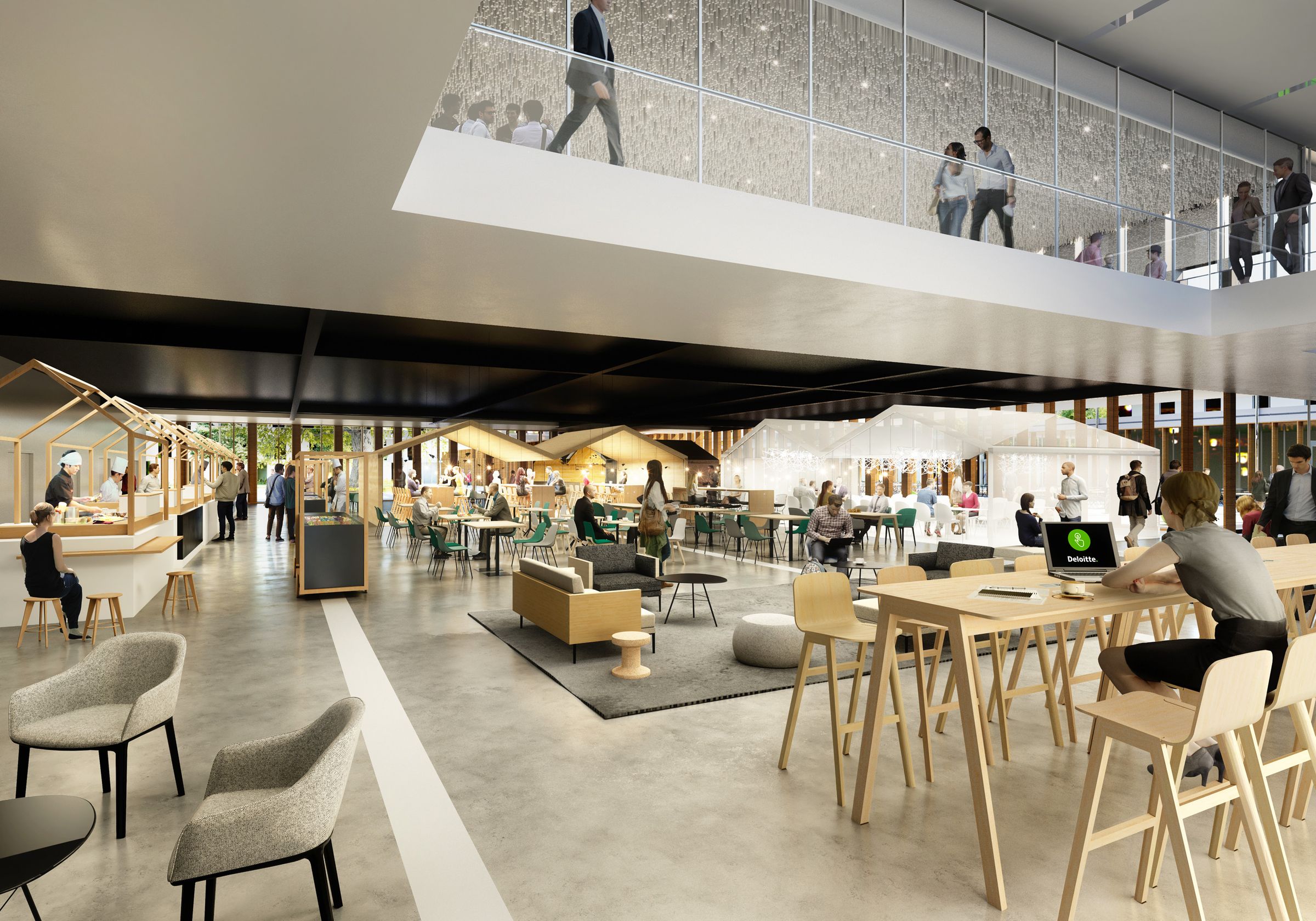 Entre celles-ci, toutes les zones services (amphithéâtre, restaurants, cafétéria…) trouvent une position centrale dans le bâtiment et peuvent s’ouvrir sur le HUB, les jardins intérieurs ou la place de la ville, leur permettant de fonctionner dans de multiples configurations toute l’année.