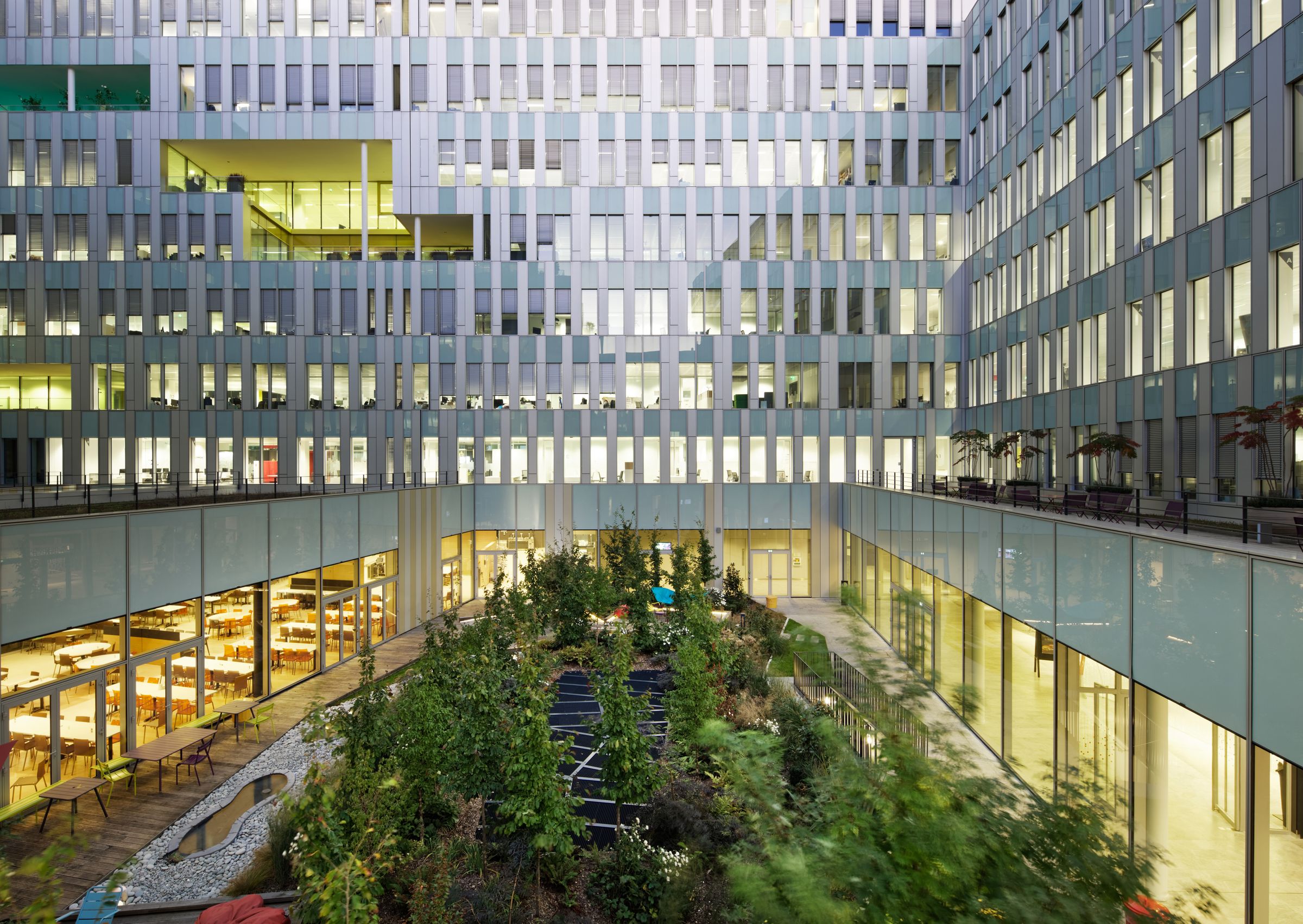 L’ensemble est relié dans un axe horizontal pour des déplacements qui favorisent les contacts et la communication. L’accent est porté sur la mise en relation avec l’environnement, celui des collaborateurs avec leur espace de travail, mais aussi celui propre au site pour une réelle contextualité sur un territoire industriel, enfin, avec un immeuble lumineux et respirant, en relation avec les jardins qui enveloppent le bâtiment.