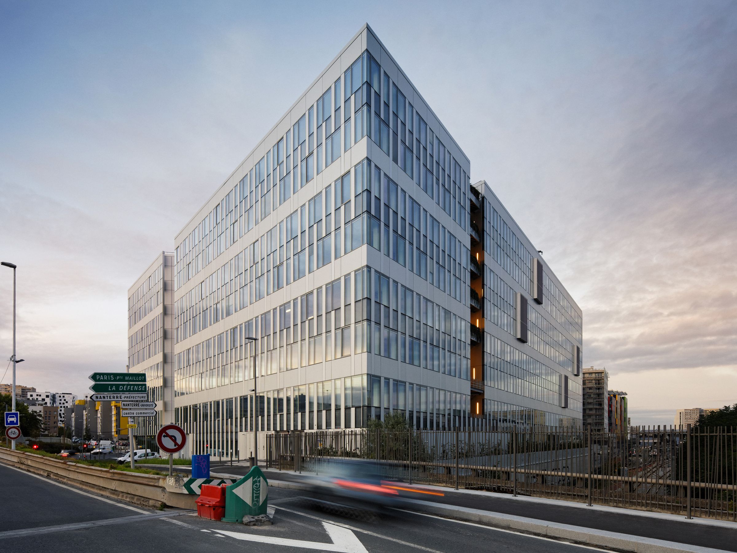 L’accueil, le restaurant d’entreprise, la cafétéria et les salles de réunion situés au rez-de-chaussée constituent une sorte de vitrine de l’immeuble. Les façades traduisent un souci de modernité par l’usage de verre clair et de panneaux d’aluminium qui en rythment la lecture. Des failles végétalisées sur ces façades apportent fraîcheur et modernité à cette construction)