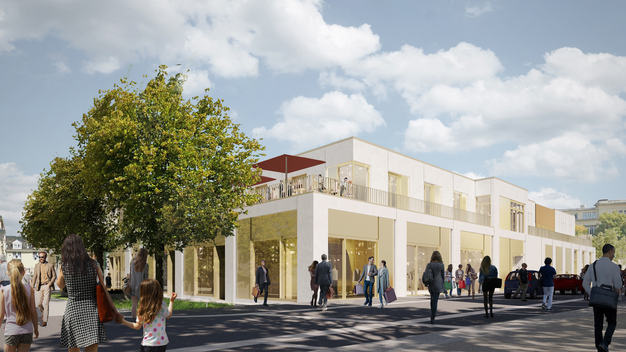 Sa forme suit sa fonction. Son volume principal abrite une halle conviviale, futur repère de vie quotidienne et de rassemblement. Ses bureaux et ses autres activités en attique sont enlacés de terrasses arborées et surmontant la place, prenant un peu de hauteur en surplomb de l’activité de ce cœur arboré, des cheminements et des commerces. Il s’insère dans un lieu influencé de ses évolutions historiques, porteur des époques qui le traverse. Ce projet est le dernier acte du devenir de la place, après l’achèvement d’aménagements extérieurs, qui soulignent aussi l’importance de la mise en valeur des espaces paysagers dans l’unification de la place aux autres espaces publics.