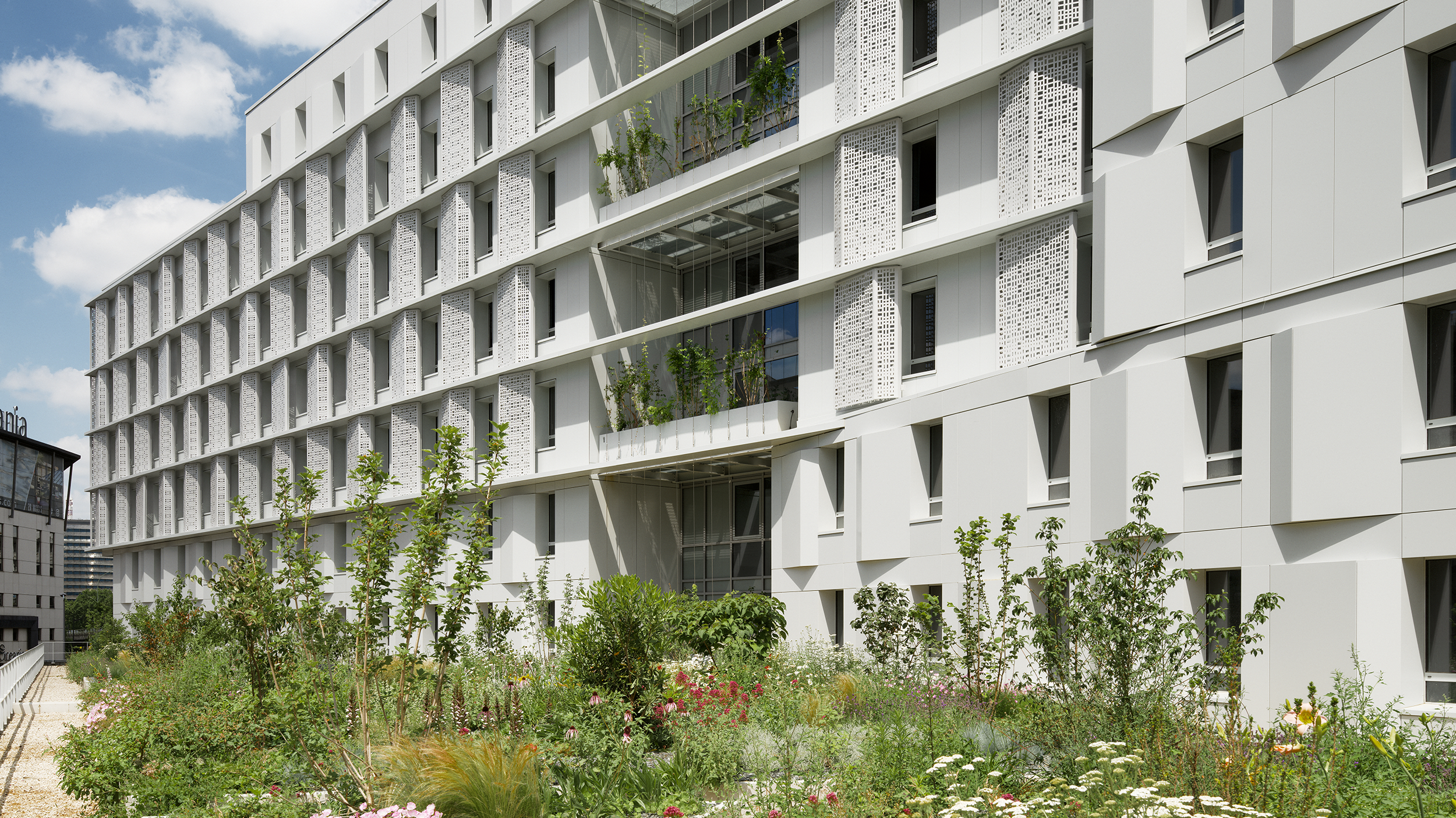 Le parti architectural de la « faille », axe central du projet, propose plusieurs strates d’animation au sein du projet avec un parvis commerçant en RDC, une terrasse végétalisée en R+1, et une terrasse végétalisée et un roof top en R+7. Le rooftop offre une vue dégagée vers Paris, créant un lien avec le paysage environnant. La végétalisation s’articule à chaque niveau du projet : en terrasse, sur le rooftop ou encore dans les loggias. Deux types de façades sont développées : ouverte et éclairée vers la ville, plus fermée et en réponse aux besoins acoustiques côté périphérique.