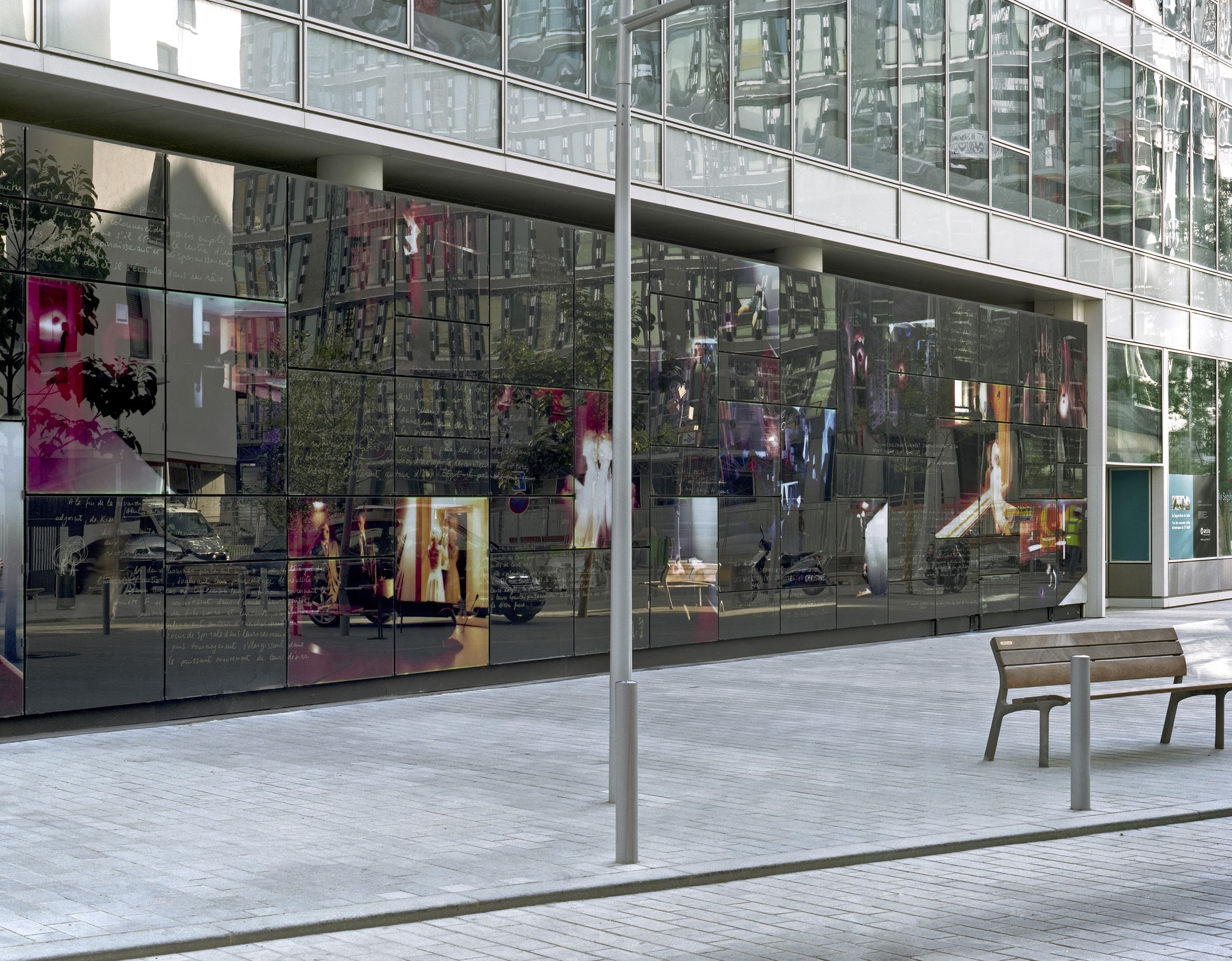 L’atrium est une verrière protégée par des stores en bois. Le hall d’entrée également, résume bien les principaux traits de la personnalité de cet immeuble : C’est est un grand volume continu permettant une percée visuelle de la rue vers l’atrium. Cette transparence donne au bâtiment une profondeur horizontale perceptible depuis l’extérieur, tandis que les ascenseurs panoramiques créent une profondeur verticale.