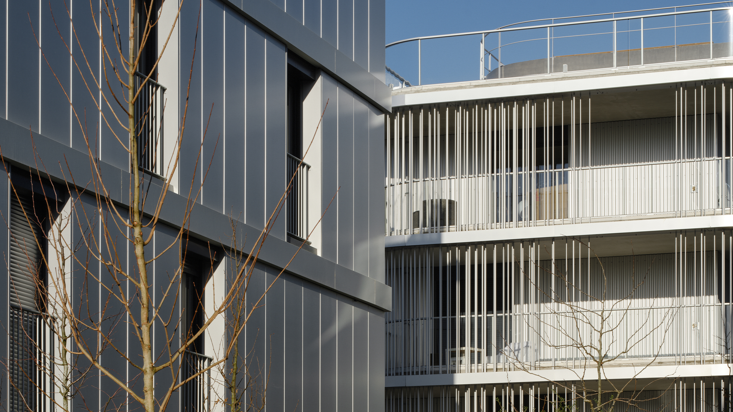 Dix-sept bâtiments composent donc ce projet autour d’une voie végétale séquencée par des espaces publics, semi-publics et privés, un jardin d’eau, une place d’éveil, une serre partagée. Ces bâtiments s’insèrent dans leur environnement par une typologie d’architecture de terrasses qui permet à la fois un élan vertical, à l’échelle de l’ensemble urbain, côté voie communale et de conserver une petite hauteur face aux maisons individuelles côté rue.