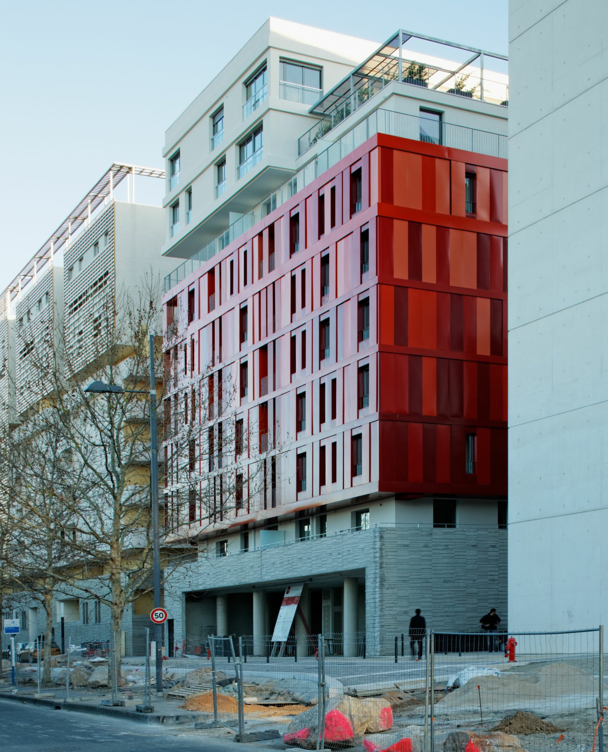Le bâtiment se décline aléatoirement en quatre tonalités de rouge sur des panneaux et des volets coulissants en aluminium laqué et perforés. Leur coulissement renouvellement constamment la perception du volume et des façades. En profondeur d’îlot, les loggias s’avancent en porte-à-faux, comme des passerelles entre espace privé et espace public.