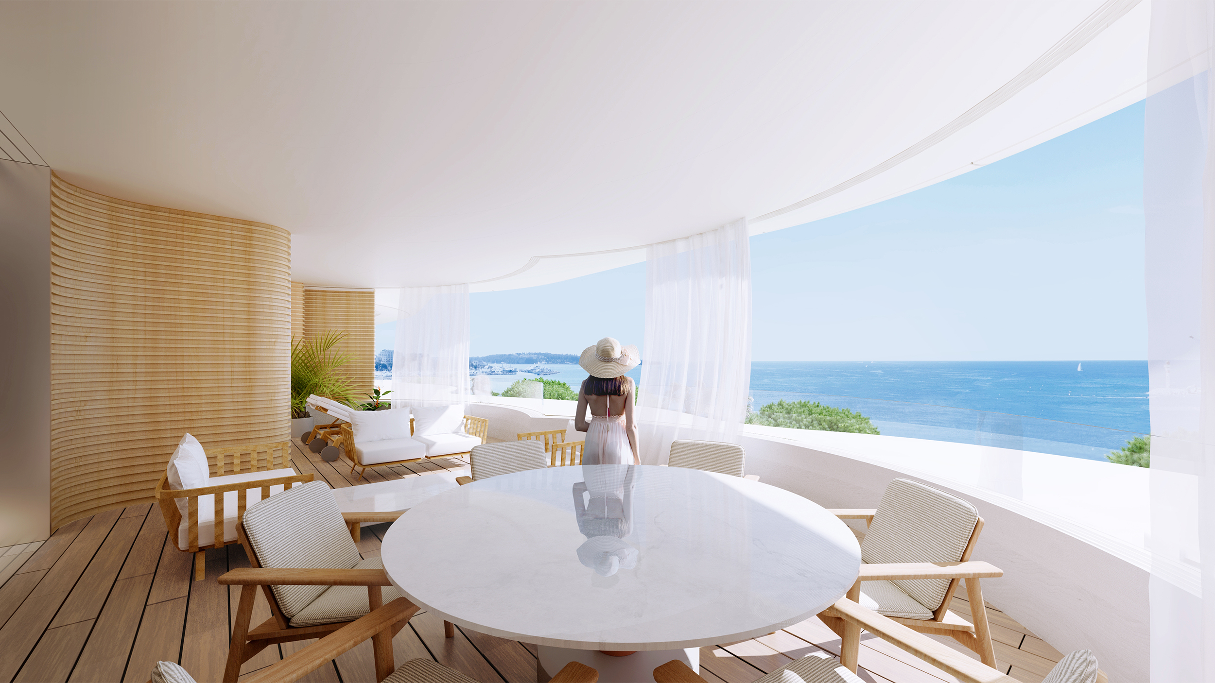 Côté mer, la façade sculpturale des logements dont les courbes douces semblent dessinées par l’érosion marine, déploie une forme singulière évocatrice des proues de bateaux et des voiles blanches tendues. Cette composition assure un confort climatique grâce à des balcons profonds qui filtrent le soleil, régulent la température et protègent du vent.