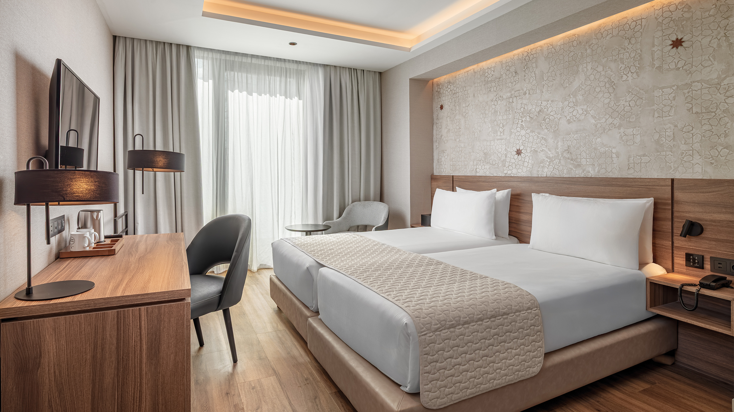 Cette mixité de programme est répartie verticalement. Elle se compose d’un socle commercial en rez-de-chaussée et de près de 12 000 m² de plateaux bureaux répartis sur les quatre premiers niveaux. Les trois derniers étages constituent l’hôtel quatre étoiles offrant 125 chambres avec son accès au toit terrasse aménagé d’une piscine et d’un chiringuito.