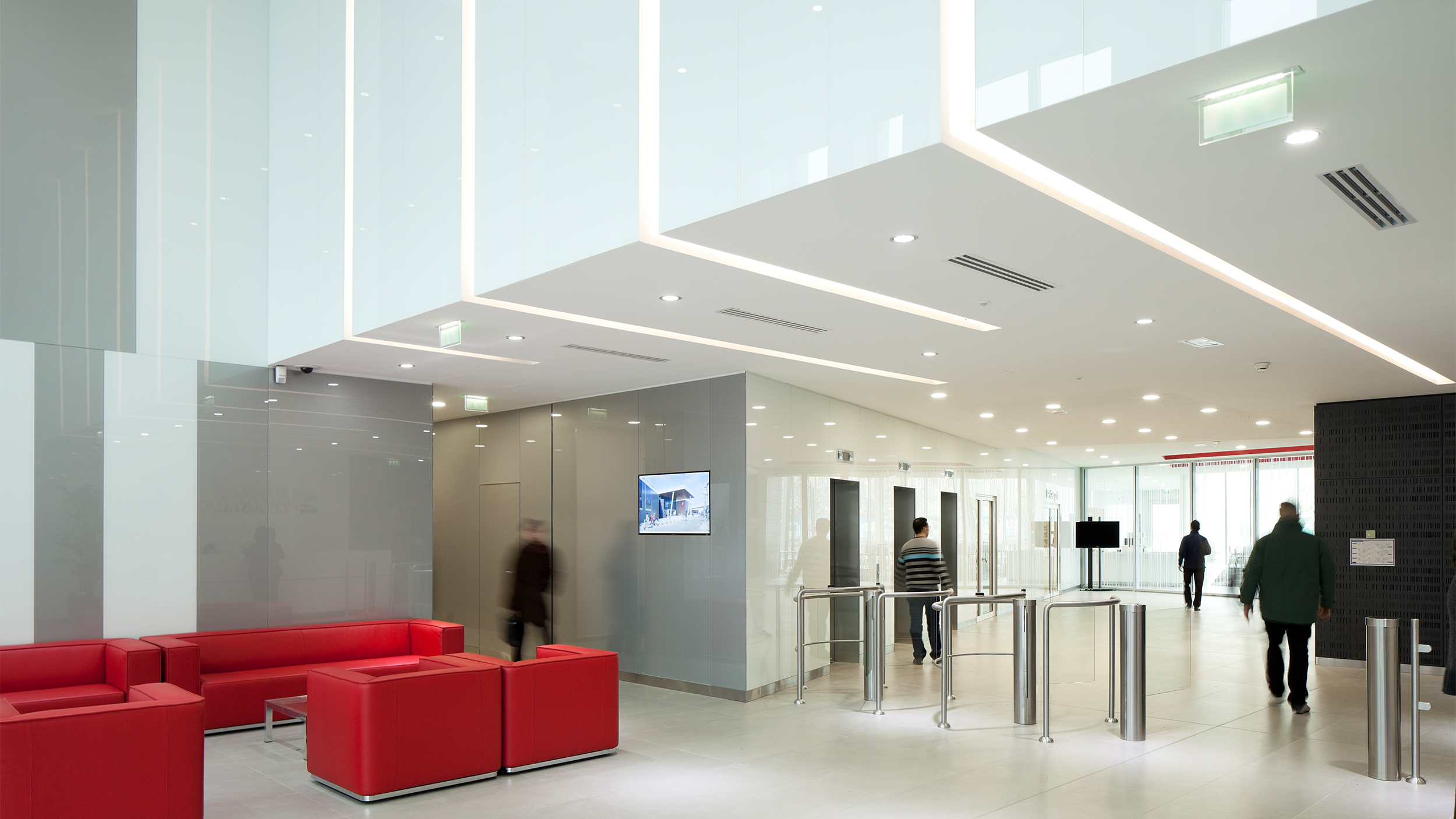 Au rez-de-chaussée se situe le hall d’accueil, le restaurant d’entreprise de 150 places et la cafétéria, bénéficiant tous deux d’un éclairage naturel et de généreuses hauteurs sous plafonds, l’auditorium de 129 places et les 5 salles de formation modulables pour un effectif de 350 collaborateurs. Le bâtiment bénéficie de bonnes ressources en éclairage naturel, relatives aux exigences HQE.