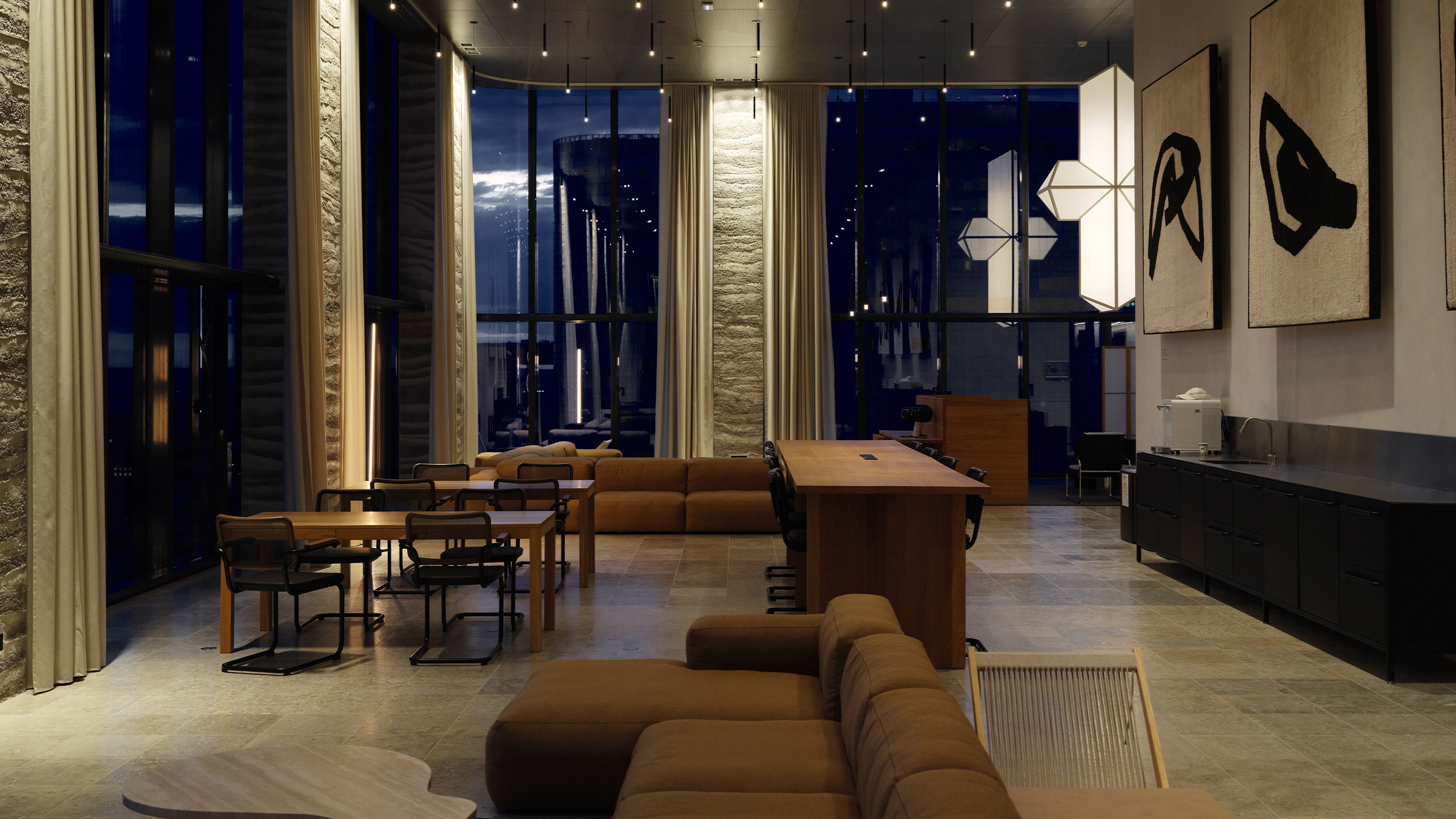 Au pied d’Aurore, un pavillon de huit niveaux est conçu comme une « lanterne ». Il accueille une partie des espaces de coworking, un business center de 4 500 mètres carrés avec un grand auditorium de 230 places ouvert sur l’extérieur. Un drugstore et un skybar complètent l’ensemble.